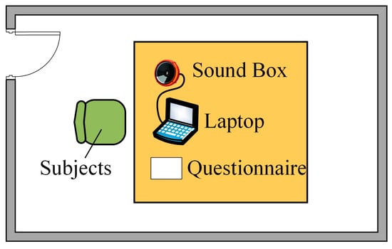 This experiment was conducted in the environmental laboratory of Qingdao University of Technology. The laboratory (area: 15 m2) was equipped with a split-type air conditioner that can maintain a constant room temperature and relative humidity. The laboratory had no windows, and plain white walls surround the walls with a double-layer insulation structure. It can effectively isolate the outside noise and eliminate the fluctuation of indoor temperature. The test bench was in the center of the lab, including a laptop, a sound box, and other test equipment. During different stages of the experiment, the sound system played different audio. Noise was emitted during the stress induction phase, while restorative stimuli were provided during the recovery phase. In addition, the visual stimuli were provided by the digital slides of natural scenes (such as the forest) played on the laptop. Figure 1 shows the floor plan of the lab.