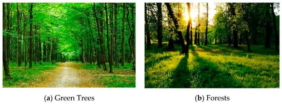 Ulrich’s recovery theory suggested that viewing videos of natural environments, with either their colors or sounds, could help alleviate stress [8]. Prior research had shown that color slides of outdoor natural scenes could be effective in promoting stress recovery [49]. Similarly, studies had shown that the sound of streaming water could serve as an effective auditory restorative approach [17]. Therefore, visual and auditory factors influence stress recovery. Based on these findings, this study explored the impact of three stress-recovery environments utilizing visual and auditory factors— visual, auditory, and audiovisual environments—on stress recovery. This study used images of green trees and forests (as shown in Figure 3) to establish a visually restorative environment, employed the sound of streaming water to establish an auditory restorative environment, and designed a combined audiovisual environment. The visual and auditory elements in this comprehensive environment were consistent with those used in the individual visual and auditory settings.