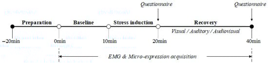 The experiment consisted of three stages, lasting a total of 40 min. The three stages were the baseline stage, the stress induction stage, and the stress recovery stage, with each stage lasting 10 min, 10 min, and 20 min. Subjects were instructed to remain as still as possible during all stages. During the baseline stage, baseline EMG data and micro-expression videos were collected. In the stress induction stage, subjects were exposed to noise stimulation for 10 min, then completed subjective questionnaires about their current stress level and emotional state. During the stress recovery stage, subjects underwent 20 min of stress recovery and then completed the same questionnaires. All participants experienced three different recovery environments (visual, auditory, and audiovisual environments). EMG data collection and micro-expression recording were conducted continuously throughout the entire experiment. The detailed experimental procedure is shown in Figure 4.