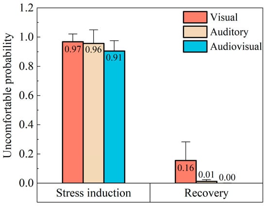 As shown in Figure 5, the mean values of the probability of discomfort during the stress induction stage are close to 1 for all three environments, indicating that the subjects felt highly uncomfortable due to the stress stimulation. During recovery, the uncomfortable probability mean values of the visual, auditory, and audiovisual environments were 0.16, 0.01, and 0.00, respectively, close to 0. The results showed that the subjects felt comfortable at this time and indicated that the conditions had significant help for stress recovery.
