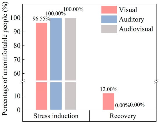 During the stress induction, the percentage of subjects who were uncomfortable under the visual environment was 96.55%; the percentage of subjects who were uncomfortable under the auditory and audiovisual environments was 100%. It indicates that the subjects were in an uncomfortable state with negative emotions and high psychological stress during stress provocation (noise).