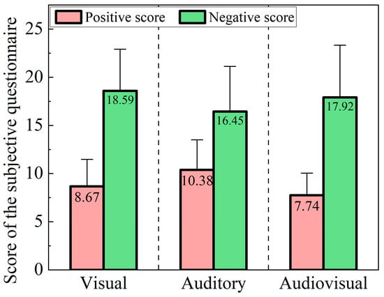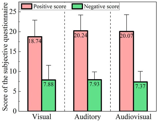 In the previous section, the variation of the MERCNN model recognition results under different environments has been investigated. Nevertheless, the correctness of the stress induction and recovery stages cannot be fully verified by facial micro-expression recognition alone. Therefore, the results of the subjective questionnaires for the three environments need to be investigated. The results of the questionnaires for the visual, auditory, and audiovisual environments were pooled for the stress induction stage. The positive emotion scores and negative emotion scores were summed separately, and the results obtained are shown in Figure 7.