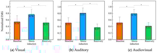 As shown in Figure 9a, in the visual environment, the mean EMG of the subjects increased from 0.54 to 0.76 (40.74% increase) from the baseline stage to the stress induction stage, which showed a significant difference in EMG between the two stages after paired t-test. Higher values in the graph indicate greater EMG signals and more intense corresponding muscle activity. This result indicates that the effect of applied pressure induction was significant, and the subjects’ facial muscle activity was enhanced. The mean EMG of the subjects in the recovery stage was 0.51 (a 32.89% decrease compared to the stress induction stage). The paired t-test showed a significant decrease in the mean EMG of the subjects during the recovery stage, indicating that the visual restorative stimulation had some restorative effect on the subjects’ psychological stress.