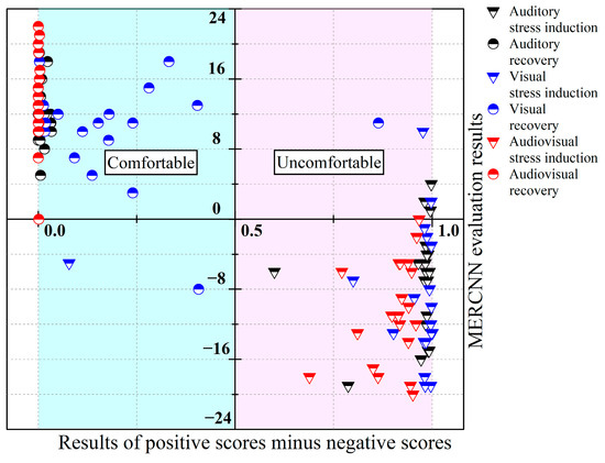 Figure 10 shows that the MERCNN evaluation and the subjective questionnaire are generally consistent during the stress induction and recovery stages. Most of the data in the stress induction stage show that the micro-expression recognition results are close to 1, and the questionnaire results are positive emotion score minus negative emotion score less than 0. The majority of the recovery stage data indicate that the findings of the micro-expression recognition are near to 0, and the results of the questionnaire are positive emotion score minus negative emotion score more than 0. The results showed that people were uncomfortable during the stress induction stage, while most were in the comfort zone during recovery. There were individual subjects whose MERCNN results were not consistent with the results of the questionnaire. The accuracy of the MERCNN model evaluation results under the three experimental conditions with the subjective questionnaire was 86% for the visual environment, 92.5% for the auditory environment, and 97.67% for the audiovisual environment.
