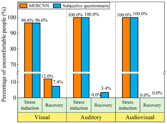 To represent the performance of the MERCNN model more visually, it is necessary to compare the results of the MERCNN model with the results of the subjective questionnaire. The percentages of uncomfortable people in the stress induction and recovery stages obtained by the MERCNN model and the subjective questionnaire are integrated into Figure 11.