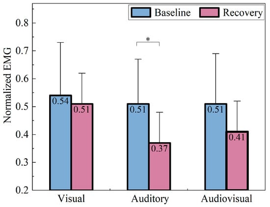 Comparison of mean values of normalized EMG between baseline and recovery stages. Note. * p < 0.05, 95% confidence intervals.