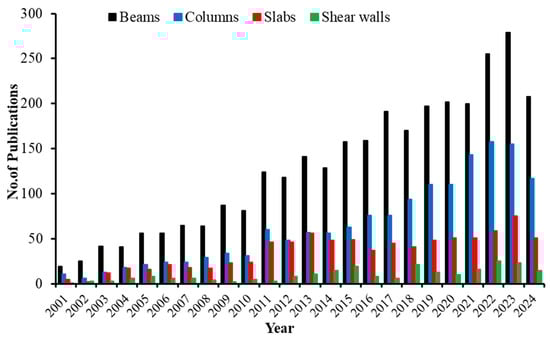 Number of Scopus-indexed publications on different GFRP-reinforced structural members by year based on Scopus []; accessed on 9 September 2024.