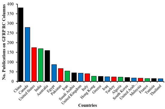 Number of Scopus-indexed publications, above 10, on GFRP-reinforced columns by country/territory based on Scopus []; accessed on 9 September 2024.