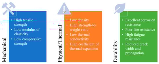 Several types are available for glass fibers, including Alkali glass (A-glass), Alkali Resistant glass (AR-glass), Chemical glass (C-glass), Dielectric glass (D-glass), Electrical glass (E-glass), Structural glass (S-glass), S-2-glass, and Reinforcement glass (R-glass). When it comes to the performance of GFRP in concrete reinforcement, the type of glass fiber used plays a crucial role in determining both the mechanical properties and durability of the composite []. In particular, A-glass fibers offer good chemical durability but are not specifically designed for high pH environments, making them less effective in concrete applications due to the risk of degradation from alkaline exposure. In contrast, AR-glass fibers are tailored to resist such conditions as a result of the addition of zirconium dioxide, which provides enhanced protection against alkaline attack. This makes AR-glass fibers particularly suitable for GFRP-reinforced concrete in chemically aggressive environments, ensuring long-term durability. C-glass fibers are known for their excellent resistance to chemical corrosion, especially in acidic environments. However, their relatively lower tensile strength compared to other glass types makes them less ideal for concrete reinforcement where high mechanical strength is a priority. D-glass fibers, on the other hand, are valued for their superior electrical insulation properties, making them more appropriate for applications that require both electrical insulation and moderate mechanical reinforcement, though they are rarely used in structural concrete reinforcement. E-glass fibers are the most widely used in GFRP due to their excellent balance of tensile strength, chemical resistance, and cost-effectiveness. However, they may be prone to degradation in highly alkaline environments unless treated for protection, though they remain highly versatile in various structural applications. For high-performance applications, S-glass fibers offer significantly higher tensile strength and modulus, making them more suitable for load-bearing GFRP-reinforced concrete structures, though they are more expensive than E-glass. A variant of S-glass, S-2 glass fibers provide even greater mechanical properties, including superior tensile strength and impact resistance, making them ideal for GFRP in high-load applications, such as seismic zones or other high-stress environments. Finally, R-glass fibers are specifically designed for reinforcement purposes, offering a balanced combination of mechanical strength and chemical resistance, making them suitable for both general and specialized structural applications. Table 1 presents the various mechanical, thermal, physical, and durability properties of different GFRPs. Figure 4 summarizes the key characteristics of GFRP materials. The following subsections discuss the physical, mechanical, thermal, and durability properties of GFRP composite bars.