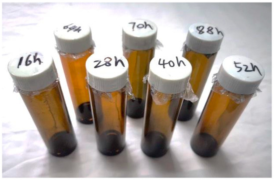 Photos of CWO dispersions stored in brown bottles with different grinding times, 16 h, 28 h, 40 h, 52 h, 64 h, 70 h, and 88 h.