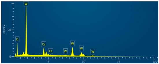 The prepared CWO was tested with an energy dispersive spectrometer (EDS, Model: Axis Supra+, Kratos) to analyze the ingredient, as shown in Figure 2. The result shows that the molecular formula of cesium tungsten oxide is Cs0.32WO3.