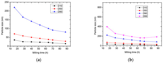 CWO particle size distribution after the dispersions being milled for different times. (a) D10, D50, and D90. (b) D10, D50, D90, and D99.