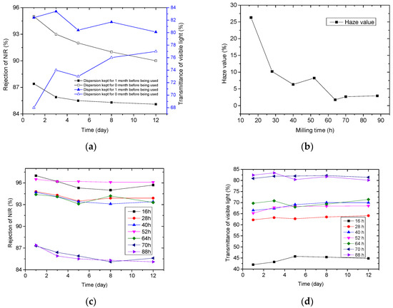The optical properties of CWO coatings with different storage and grinding time are shown in Figure 4c,d. The larger particle sizes of CWO dispersions with less grinding time, such as 16 h and 28 h, show higher NIR blocking, demonstrating a high stability among the optical performances. However, the transmittance of visible light is low and the haze value is very high (26%). In contrast, the CWO dispersions with smaller particle sizes and with more grinding time, such as 70 h and 88 h, show higher transparency and transmittance of visible light. However, the NIR blocking with more grinding time is lower than that of with less grinding time. When the D90 value of the CWO dispersion is less than 100 nm, high transmittance of visible light will be obtained, while the NIR blocking falls to about 5% to 7% compared with that of D90 > 100 nm.