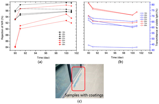 NIR rejection and transmittance of CWO sample coatings, 90 d without direct sunlight, from 91 d to 100 d with direct sunlight, 101 d in the dark. (a) NIR rejection of CWO sample coatings from 91 d to 101 d. (b) Transmittance of visible light from 91 d to 101 d. (c) Pictures of CWO coating samples on the west-facing balcony.