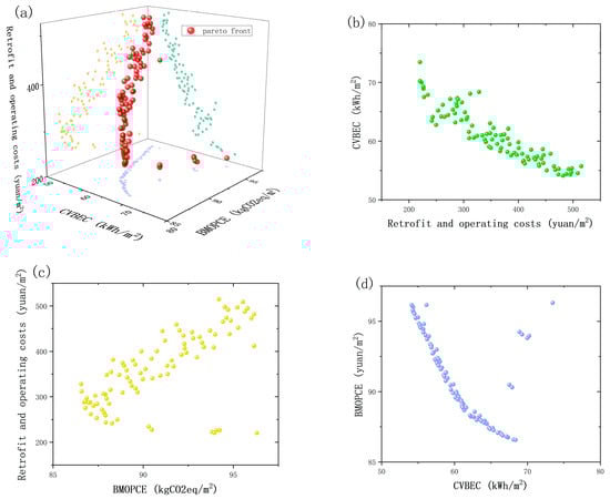 - Using the PSO-SVM-NSGA-II multi-objective optimization algorithm, which combines Particle Swarm Optimization (PSO) for tuning SVM hyperparameters based on social behavior patterns, and Support Vector Machine (SVM) for training data samples obtained from EnergyPlus simulations. Non-dominated Sorting Genetic Algorithm II (NSGA-II) is used for identifying the best trade-offs between multiple objectives. This integrated approach effectively optimizes the building envelope and photovoltaic components to reduce energy consumption and carbon emissions. Technique for Order Preference by Similarity to Ideal Solution (TOPSIS) method to select the final solution. This integrated approach was used to optimize the external envelope structure and photovoltaic components, leading to significant reductions: overall energy consumption decreased by 41% (from 105 kWh/m2 to 63 kWh/m2), carbon emissions by 34% (from 13,307 tCO2eq to 8817 tCO2eq), and retrofit and operating costs by 20% (from CNY 13.12 million to CNY 10.53 million) over a 25-year period.