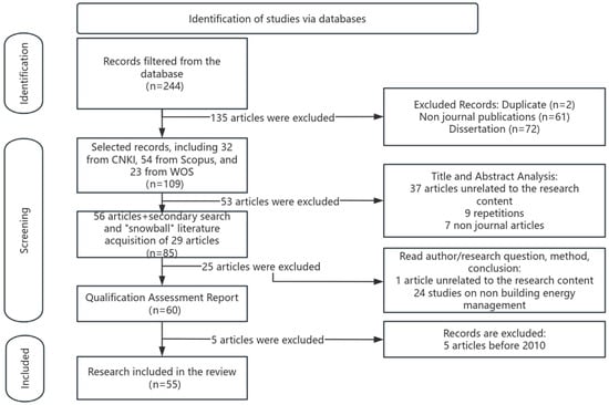 This study formulated literature inclusion criteria, as shown in Table 1, for the 244 initially retrieved studies (32 retrieved from WOS, 107 retrieved from CNKI, and 105 retrieved from Scopus) in order to ensure the accuracy and reliability of the literature analysis results and accurately present the theoretical and empirical research on building energy management at home and abroad, based on the research questions. After the title and abstract screening, a second search was carried out that added 29 additional studies to the results, ensuring a more thorough review. The manuscript was exported to Zotero for methodical screening in order to guarantee the validity and reliability of the research sample. Article 5 rigorously reviews the abstract and title, and the search term will also be eliminated if it appears in the “index keywords” rather than the “keywords provided by the author” list. Article 6’s goal is to narrow down the study subject of the literature in the area of architecture. The following studies will be eliminated as the examination goes on: those that concentrate on energy-related issues as opposed to energy management; those that, instead of looking into the building industry, go into the industrial or transportation sectors; and those that provide specific responses to the study’s questions and submit energy management with an emphasis on contract energy management.