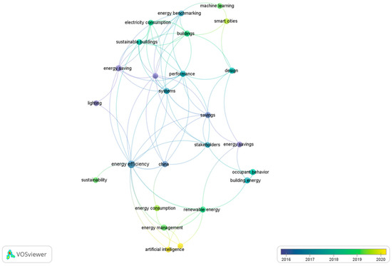 The fundamental components of research are keywords. Keywords like “energy management, public building, energy saving, and best practice” are utilized as filtering criteria while looking for studies. However, several other keywords surfaced during the literature scanning procedure. The VOS viewer program was utilized to analyze contributions and display how they relate to one another, as seen in Figure 2. An illustration of the produced keyword network is shown in the image. The degree of relationship between two keywords is shown by the lines connecting the nodes, and the size of each node in the network reflects the frequency of the occurrence of the term. The graphic shows that the keywords are grouped into six groups according to the colors used. Energy efficiency is the keyword that appears the most frequently.