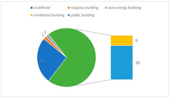 Public buildings are located at a distance from the other five clusters when seen through the lens of clustering observation, according to the keyword analysis of the literature mentioned above. This study initially categorized and statistically examined the research objects before carrying out an examination of the complete literature. Public structures, residential buildings, zero energy buildings, religious buildings, and buildings with ambiguous building categories are among the building types covered in the 55 publications. The results are displayed in Figure 5. It is evident from the figure that civil constructions are the subject of the inquiry. The primary focus of the literature is on the study of public buildings, which is not surprising given that the term “public building” was used throughout the literature screening procedure. But why do other kinds of structures, including residential ones, continue to exist? It was discovered through a review of the literature that while various building types cannot be totally separated from one another, building type may affect how buildings manage their energy. The inferences made from various building kinds can also be applied to other building types at the same time.