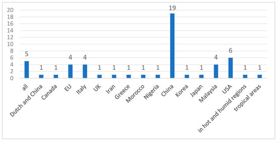 Regarding the categorization of the 14 nations, some material is broken down by geographic area, particularly in relation to the European region, which is primarily concerned with the building’s climatic environment. As a result, it can be concluded from the data above that there are comparatively more studies available in relation to China and the United States, where the climatic environment is more complicated and influenced by the region’s energy supplies. Concurrently, research was discovered to have been carried out in the study region utilizing climate as a characteristic, supporting the previous assertion.