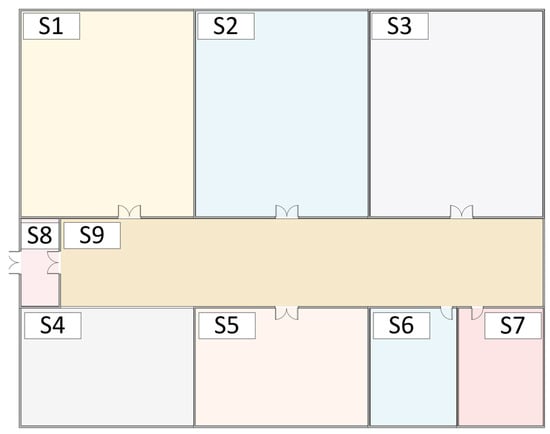 The case study presented in Figure 4 was used to test and validate the creation process presented in this paper. The interior of the fictitious building contains a total of 9 sectors. It was decided to focus on the interior finishing of the building, since, as the structure of the walls had just been installed, this usually represents the moment during construction when managing the available space and travel is the most important. Thus, the work presented will begin with the installation of the wiring and electrical boxes, followed by the installation of the gypsum panels, the joints, the painting, the electrical finish, the suspended ceiling and, finally, the finishing of the floors.