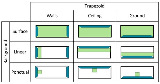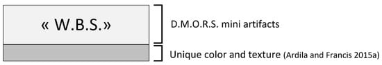Figure 5 represents the standard mini artefact used to represent each OT on the DMORS. The upper part is used to represent the two (2) criteria []: (i) the internal location in the sector—whether the work is on the ground, the walls, or the ceiling and (ii) the internal movement—whether the work occupies the space in the area, or in a linear or punctual manner. The combination of these two (2) criteria provides nine (9) types of space occupancy, as shown in Figure 6. To make the interpretation easier, the internal location is represented by a trapezoid. So, if the trapezoid is on the side of the mini artifacts, it means that work is carried out on the walls. By the same logic, when the trapezoid is on the top it means that works is conducted on the ceiling, and when on the bottom it means that the OT is placed on the ground. As for the internal movements, these are represented by the shape of the background. A fully filled mini artefact represents an OT that will occupy a large surface area, a rectangle represents a linear OT, and a small square represents an isolated OT. Ardila and Francis [] described the standard protocol that is used for the unique color and texture on the lower part of Figure 4 to help distinguish each OT on the DMORS.