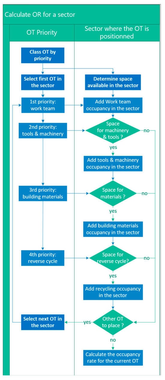 For a given period, each sector of the project has a list of OTs that must be positioned. The manager must therefore prioritize the OTs present. The DMORS optimization process is based on two (2) elements: (i) the prioritization of the OTs present in a sector/period to calculate the OR (Figure 9) and (ii) what to do if a sector’s OR is greater than 100%. Then, when calculating the OR for a sector, the OTs are positioned successively according to this prioritization by validating if there is enough space in the sector before positioning the next OT. In the event that there is not enough space to position an OT or the OR of the sector is greater than 100%, the manager will have to choose between leaving positioning as is and accepting that this sector will be overused or reviewing the prioritization of OTs and moving the lower priority OTs to another sector.