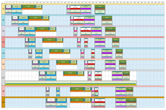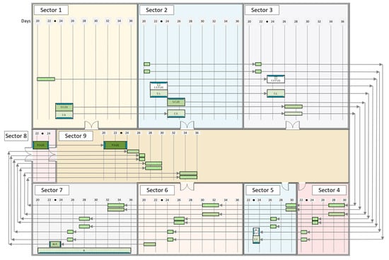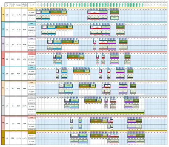 The initial creation of the DMORS is mainly carried out using the same procedure as for chronographic modeling [,], and by applying the mini artifacts in Figure 10. This will generate the schedule presented in Figure 11 and Figure 12. It will then be possible to display the occupancy that each OT will have in the area where they are positioned and to calculate and display the OR by period, for each sector, for each floor, and for the entire project, thus giving the schedule presented in Figure 13.
