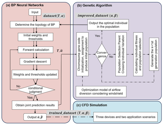 - Angle scheme training. Following the acquisition of the optimal solution set for jet angles and windshield angles through GA global search, the predictive model and optimal solution set are retrained using the BP neural network to develop the neural network model for temperature-jet angles and windshield angle.