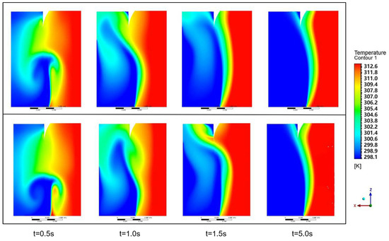 Simulation verification is carried out based on the angle control system proposed in this paper to characterize the thermal insulation effect of the air curtain in terms of airtightness. In the two conditions, simulations are conducted for three groups of control schemes at four key time nodes: the initiation state (t = 0.5 s), the unsteady states (t = 1.0 s and t = 1.5 s), and the steady state (t = 5.0 s). The simulation effect diagrams for these conditions are depicted in Figure 6.