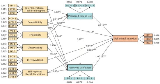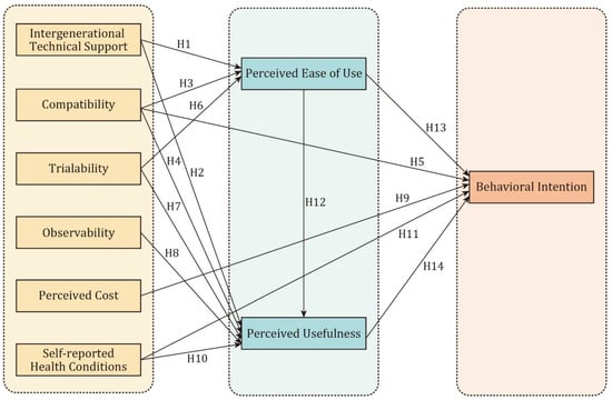 Considering the significance of the TAM variables—perceived usefulness, perceived ease of use, and behavioral intention—in explaining older people’s behavioral intention toward smart home technologies, this study integrated these variables into the theoretical framework. Moreover, most existing research relies on single-theory models, and there is a lack of studies examining older people’s behavioral intention toward smart home systems from the perspective of the IDT. A comprehensive review of the literature indicates that perceived usefulness and perceived ease of use moderate the relationship between IDT variables and behavioral intention. To thoroughly investigate the complex mechanisms underlying the behavioral intention of older people, this study combines the TAM and IDT models. Furthermore, this study incorporates external variables, including self-reported health conditions, perceived cost, and intergenerational technical support, based on the unique circumstances and requirements of older people, thereby extending the existing theoretical model. The research model not only helps in gaining a deeper understanding of the behavioral intention of older people toward smart home systems but also enhances older people’s independent living ability and biophilic experiences by improving the compatibility and trialability of the system, thereby contributing to their physical and mental health. In addition, intergenerational technical support can help older people better adapt to and become proficient in using smart home systems, thereby enhancing their behavioral intention. Drawing from the 14 hypotheses discussed above, this study developed an extended model to investigate older people’s behavioral intention toward smart home systems, as illustrated in Figure 1.