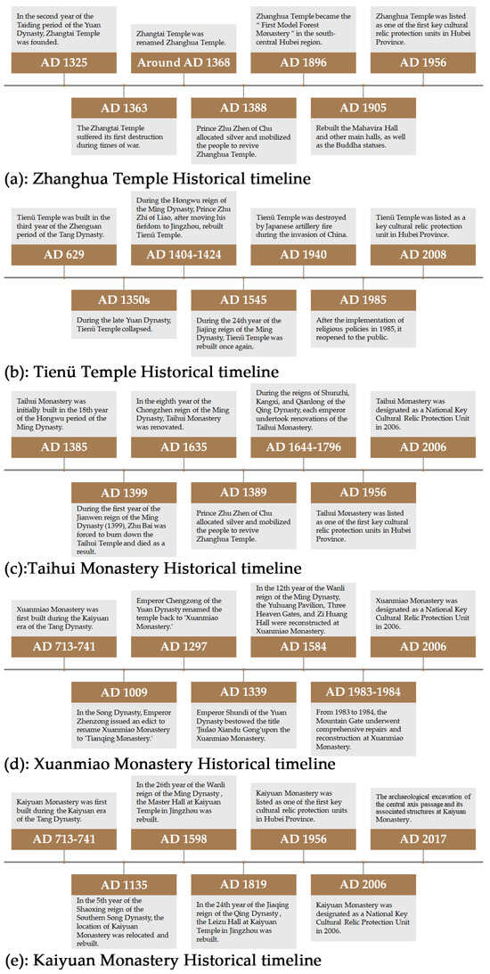(a) Zhanghua Temple was originally built in the second year of the Taiding period of the Yuan Dynasty. By the Ming and Qing dynasties, it had become renowned as one of the “Ten Directions Chan Forests” along with Guiyuan Temple in Hanyang and Yuquan Temple in Dangyang. In the 22nd year of the Guangxu reign, it became the “First Model Forest Monastery 第一模范丛林” in the south-central Hubei region [37]. In 1956, it was designated as a key cultural relic protection unit in Hubei Province. (b) Tienü Temple was first constructed in the third year of the Zhenguan period of the Tang Dynasty. It collapsed at the end of the Yuan Dynasty and was rebuilt in the 24th year of the Jiajing period of the Ming Dynasty. In 1940, it was destroyed by Japanese artillery fire during the invasion of China. After the implementation of religious policies in 1985, it reopened to the public [38] and was listed as a key cultural relic protection unit in Hubei Province in 2008. (c) Taihui Monastery was initially built in the 18th year of the Hongwu period of the Ming Dynasty. It was renovated in the 8th year of the Chongzhen period of the Ming Dynasty and underwent several repairs during the Shunzhi, Kangxi, and Qianlong reigns of the Qing Dynasty [39]. (d) Xuanmiao Monastery dates back to the Tang Dynasty. Although the current Xuanmiao Monastery is not on the original site of the Yuan Dynasty’s Jiulao Xiandu Palace, it still occupies the location of the Ming Dynasty Xuanmiao Monastery [40]. (e) Kaiyuan Monastery was established during the Kaiyuan period of the Tang Dynasty, hence its name. The existing central axis with one gate and three halls was rebuilt during the Ming and Qing dynasties. It is one of the important representative buildings from the flourishing period of Taoist culture in Jingzhou [41]. Along with Taihui Monastery and Xuanmiao Monastery, it is known as one of the “Three Monasteries of Jingzhou”. In 2006, these three were collectively listed as National Key Cultural Relic Protection Units. Although these two temples and three Taoist monasteries were initially constructed in different periods, they all underwent rebuilding and restoration during the Ming and Qing dynasties. The architectural styles that have been preserved to this day are essentially consistent, and they hold extremely high historical value. Figure 1 shows the historical timeline of the research subjects.