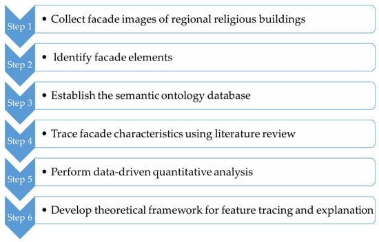 In the study of traditional residential buildings, some scholars have used HOZO to analyze the elements of building facades. For instance, Wang et al. [43] constructed a sample library of facade forms for colonnaded buildings, JIANG et al. [44] built a visual and expandable semantic description system for traditional village residential facades, Chen et al. [45] established a prototype library for the facade forms of historic residential and commercial buildings, and SUN et al. [46] developed a database of architectural facade elements for traditional commercial streets in southern and western Anhui. However, these studies are limited to analyzing facade element characteristics and constructing semantic ontology systems, lacking literature tracing or quantitative data analysis of samples. To establish a semantic system database for religious building facades with regional characteristics, the first step is to collect images of the facades from two temples and three Taoist monasteries within the study area. Unlike semantic analysis of modern building facades, due to the long historical span, low preservation levels, and complexity of ancient building structures or paintings, automated recognition of facade elements poses significant challenges. Therefore, to ensure the accuracy of the semantic recognition of facade elements, all facade semantic elements were manually reviewed through literature research [47,48,49,50,51,52], and the semantic ontology database was built using HOZO software. The standout elements from each part were quantitatively analyzed, and the regional characteristics of religious building facades were traced and explained using a literature survey method. Ultimately, a theoretical framework was established that includes a semantic ontology database, quantitative data analysis, and the interpretation of the feature origins. Figure 2 illustrates the investigation and research process of this paper.