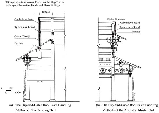 In ancient architecture, the roof design was a significant reflection of the hierarchical system, with its construction and form subject to strict regulations. Similar to traditional official buildings, the roof structure of religious buildings gradually rises along the central axis, typically adopting a double-eaved hip-and-gable roof for the main hall. The methods of handling the eaves and gables in these hip-and-gable roofs exhibit distinct regional characteristics. For example, the hip-and-gable eave handling methods used in the Sanqing Hall and the Ancestral Master Hall of Kaiyuan Temple differ from those described in the Song Dynasty’s “Yingzao Fashi 营造法式”, which states: “Between the ends of the rafters, both sides should extend beyond the column heads, with four to ten rafters protruding by 4.5 to 5 chi (Chinese feet)” [55]. They also differ from the Qing Dynasty’s “Engineering Code of the Ministry of Works 工部工程做法则例”, which stipulates: “The outer edge of the gable board is placed by retracting one rafter diameter inward from the centerline of the rafter on the facade” [56]. Specifically, the eave handling method in the Sanqing Hall involves retracting 130 cm inward from the centerline of the rafter on the facade (equivalent to one step’s framework). In contrast, the method used in the Ancestral Master Hall involves pushing the gable board outward by half the rafter’s diameter from the centerline of the rafter on the facade [57]. These two methods exemplify the regional characteristics of hip-and-gable eave handling in the Jianghan area. Figure 3 presents a schematic diagram of the hip-and-gable eave handling method.
