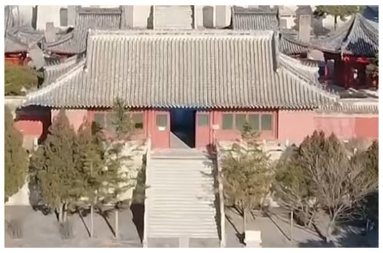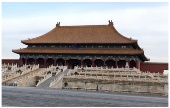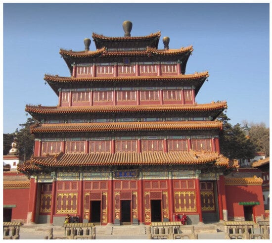 The Chu people revered the beauty of linear forms, having a particular fondness for curves [58]. This aesthetic preference is directly manifested in architecture through the prominent upward sweep of the eaves on roof facades, which distinguishes Jingchu architecture from that of both the northern and southern regions. For instance, in the northern architecture, the main facade of the Shenma Hall in Beizhen Temple, Beizhen City, Liaoning Province, features a hip-and-gable roof (Figure 4); the Hall of Supreme Harmony in the Forbidden City in Beijing has a double-eaved hipped roof (Figure 5); and the Dasheng Pavilion in Puning Temple, Chengde, has a double-eaved pavilion roof (Figure 6). Regardless of the roof form, northern architecture typically features roofs with gentle slopes, a characteristic closely tied to the hierarchical system of buildings. The Beizhen Temple was rebuilt during the Hongwu period of the Ming Dynasty, the Hall of Supreme Harmony in the Forbidden City represents the highest rank of architecture since the Ming and Qing dynasties, and the Dasheng Pavilion in Puning Temple is also an imperial structure. Therefore, the facade design of these buildings was not intended to convey a sense of dynamism but rather to embody solemnity and grandeur. In this study, it is observed that the eaves of buildings such as Xuanyao Temple, Kaiyuan Temple, and Zhanghua Temple, although also royal structures, generally exhibit a pronounced upward sweep. This is related to climatic factors (the Jingzhou region is humid and rainy) and reflects the need for these buildings to adapt to the local climate while maintaining the solemnity associated with royal architecture. The upward-curved eaves design not only reduces the impact of the eaves on indoor lighting but also enhances the visual appeal of the buildings.