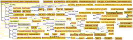 The Northern Song Dynasty architectural scholar Yu Hao, in his work “Mu Jing木经”, divided the structure of a building into three parts: the platform base, the building body, and the roof. He noted that “all buildings have three parts: the portion above the beams is the upper part, the portion above the ground is the middle part, and the steps are the lower part”. This article draws on the classification method from “Mu Jing木经” and divides the facade structural elements of religious architecture into three sections: the upper section (roof), the middle section (building body), and the lower section (platform base). As the transformation of ancient architectural heritage into “revitalized assets” progresses, the public’s subjective experience of historical building spaces varies, with the greatest focus on facade decorations, colors, and doors and windows [53]. This indicates that the detailed decorations of building facades have the most significant impact on the public’s spatial experience. Therefore, the statistical analysis of facade elements should be approached from two perspectives: facade structural elements and detailed decorative elements, to comprehensively summarize and organize these features.