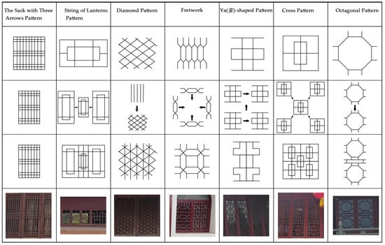 - Huizhen, Z.; Chun, C.; Yunzhang, L. Study on the Decoration of the Lattice Core of the Windows and Doors of the Ancient Buildings with Wooden Structures in Mianyang. Shanxi Archit. 2022, 48, 14–17+21. [Google Scholar]