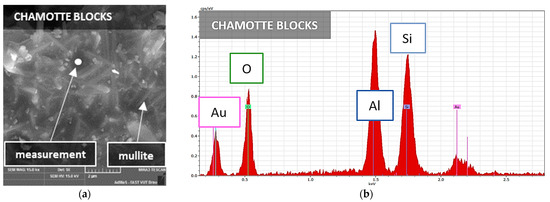 Chamotte blocks: (a) SEM image of analyzed area with magnification of 15,000×. (b) Elemental analysis of chamotte waste sample.