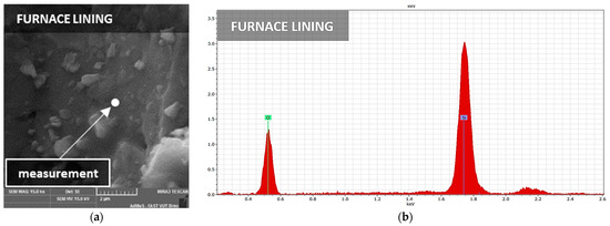 Furnace lining: (a) SEM image of analyzed area with magnification of 15,000×. (b) Elementary analysis of furnace lining sample.
