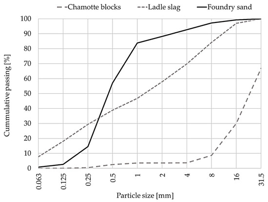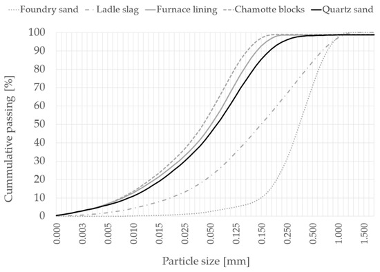 Figure 4 shows grain size and Table 3 shows physical properties of materials after processing in a ball mill. Ladle slag and foundry sand show a higher proportion of coarse parts above 0.16 mm. These coarse parts are not present in chamotte blocks and furnace lining. CB and LS granulometric curves copy the curve of quartz sand, which is used as a reference. Basic physical properties of quartz raw materials are very similar.