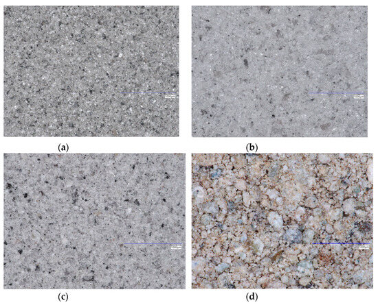 Digital microscope images (magn. 100×) of used secondary raw materials after processing: (a) foundry sand; (b) furnace lining; (c) chamotte blocks; and (d) ladle slag.