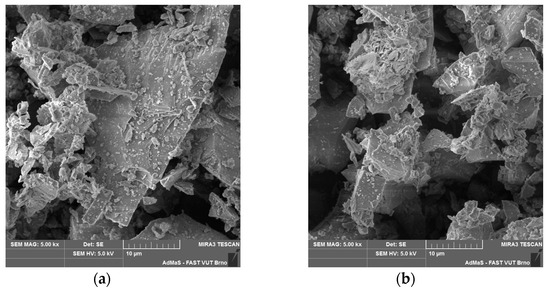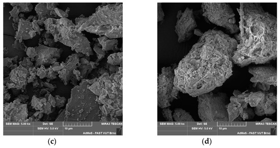 SEM images (magnification 5000×) of used secondary raw materials after processing: (a) foundry sand; (b) furnace lining; (c) chamotte blocks; and (d) ladle slag.