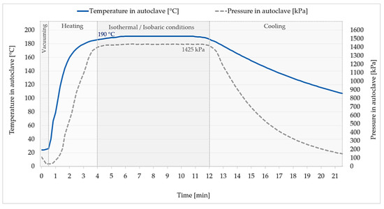 Autoclaving took place in a laboratory autoclave in the environment of saturated water vapor. The autoclaving process consisted of four stages. At the first stage, the pressure was decreased to 50 kPa. This step lasted 30 min. At this stage, the aerated concrete sample begun to warm up, which reduced possible damage caused by the difference in temperatures between the core and surface. The second stage was a temperature increase. Pressure at this stage reached 1.4 MPa, which corresponds to the temperature of 190 °C. The temperature of 190 °C was reached after 5 h. The third stage was maintaining the hydro-thermal conditions (190 °C) for 8 h. The fourth and last stage was a gradual cool down. Autoclaving process parameters are stated in Figure 7.
