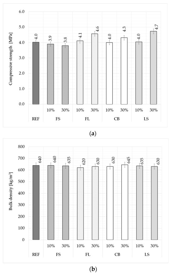Compressive strength (a) and bulk density (b) of samples with admixture of foundry sand, waste furnace lining, chamotte blocks, and ladle slag.
