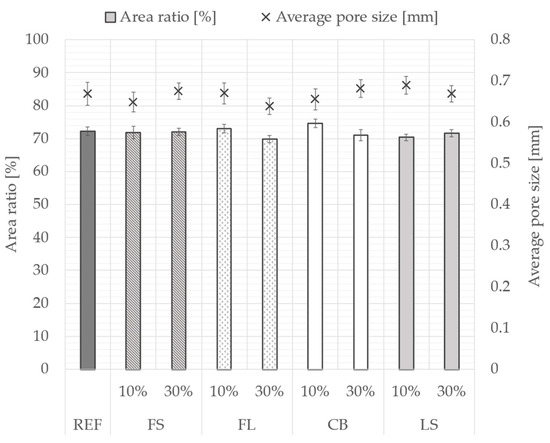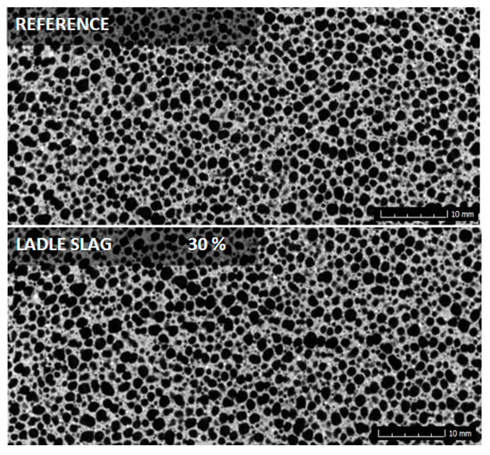 Figure 9 shows the reference sample and the sample with 30% of LS. The distribution of pores is similar in both images, and the sizes of the pores determined by CT range from 0.2 mm to 2 mm. The same parameters were observed in the other samples, too. The porous structure was formed during the aeration of the material and was influenced by many internal and external factors. The influence of external factors is minimal in this case as identical technology was used for preparation. At the stage of maturing, quartz sand creates a firm frame, and the function of a binder is provided by lime and cement [35]. The internal factors are different only in the case of the replacement of quartz sand with secondary raw material. The amount of mixing water used is one of the internal factors. As the secondary raw materials used have the same water absorbing capacity as quartz sand, the amount of water remained constant. At the same time, all samples had an almost identical consistency; therefore, the porous structure of all samples was similar (Figure 10).