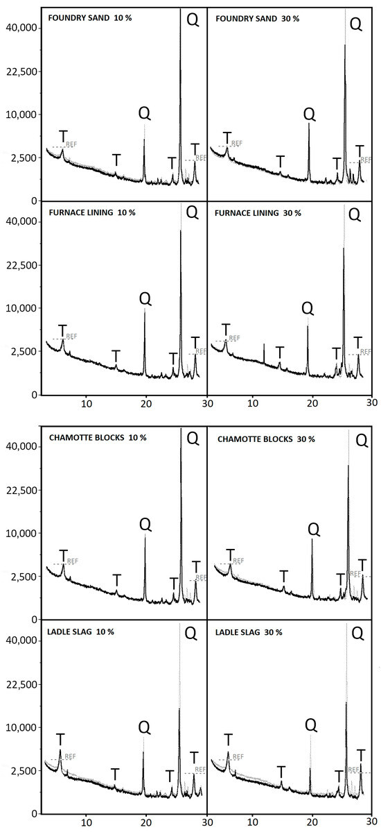 - Furnace lining increased the strength of the samples by up to 15% because of the high content of aluminum oxide, which has a positive effect on the microstructure of the samples. This positive trend was observed even in the case of a higher substitution rate of 30%.