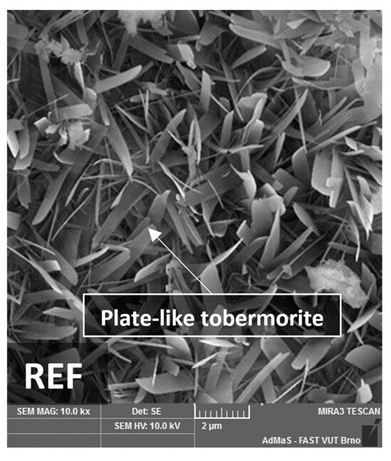 The SEM result (Figure 12) confirms the formation of tobermorite in the reference sample. Crystals of tobermorite in the reference sample have a plate-like shape. The crystals are interlocked and form a regular structure.