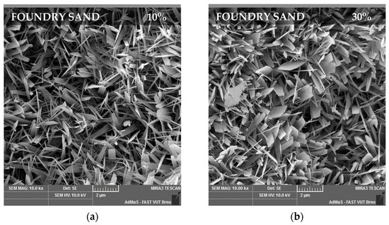 The mixture with 10% FS (Figure 13a) contains crystals of plate-like tobermorite. If the proportion of replacement is higher (Figure 13b), the crystallization of tobermorite remains unchanged. According to this fact, it is not advantageous to use foundry sand in larger amounts due to its negative effect on the mechanical properties.