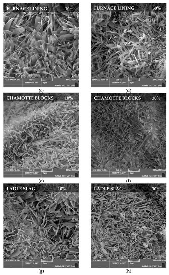 SEM image of samples with 10% and 30% admixture with secondary raw materials at magnification of 10,000×: (a) 10% foundry sand, (b) 30% foundry sand, (c) 10% furnace lining, (d) 30% furnace lining, (e) 10% chamotte blocks, (f) 30% chamotte blocks, (g) 10% ladle slag, and (h) 30% ladle slag.