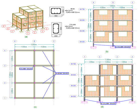 The geometry of structure typology: (a) 3D view, and typical cross sections of the typology, (b) elevation in x–direction, (c) plan view, (d) elevation in y–direction.