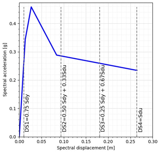 The methodology proposed by [] is followed to develop the fragility and vulnerability curves, which requires transforming the pushover curves in a linearized manner to an Acceleration Displacement Response Spectrum (ADRS) system. First, it is required to transform from MDOF to SDOF using pushover curves previously obtained with Equations (1)–(3) of the 150 simulations, here is the equivalent mass, is the vibrations mode of the fundamental period, is the mass of each floor, is the spectral acceleration, is the base shear of the pushover curves, is the spectral displacement, is the roof displacement in an MDOF system, and is the participation factor of the first vibration mode.
